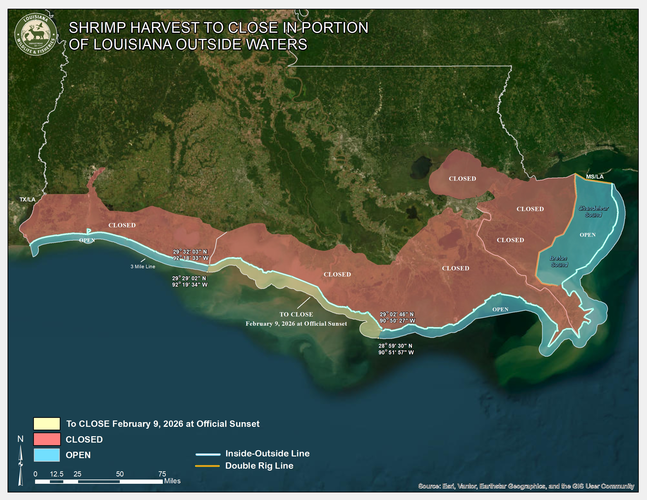 Закриття стосується зовнішніх вод між Caillou Boca та каналом Freshwater Bayou. Межі визначені серією географічних координат від лінії внутрішніх і зовнішніх вод до три-мильної лінії; детальну карту див. за посиланням або на зображенні, доданому до повідомлення. Карта показує точні початкові та кінцеві точки кожної межі закриття.