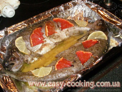 Духовку розігріти до 200 °C. Поставити форму з рибою у духовку, на перші 15 хвилин накрити фольгою. Потім зняти фольгу і допікати до готовності ще 15 хвилин.