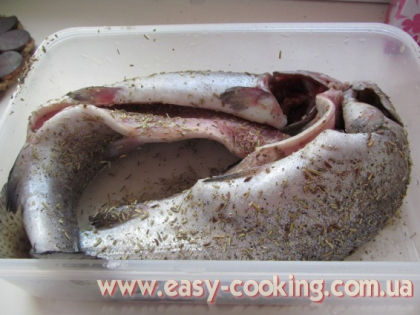 Рибу помити та обсушити паперовим рушником. Натерти сіллю, перцем, приправами та оливковою олією зовні і обережно всередині, щоб не пересолити.